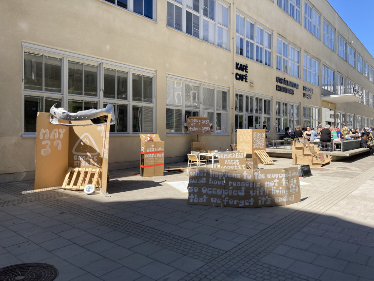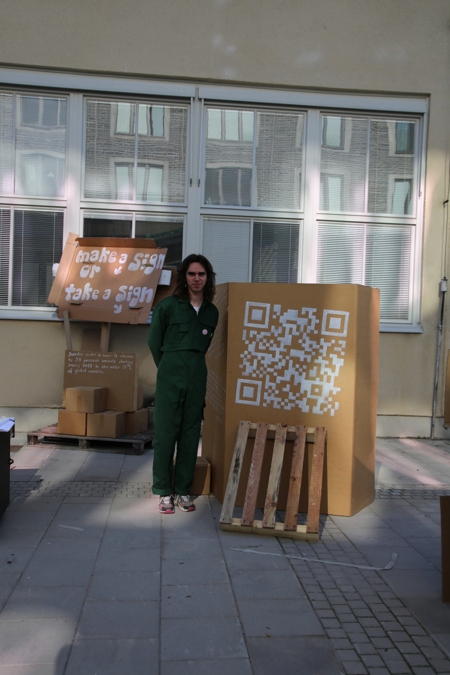 Since i had a quite large area outside the university building at my disposal, i chose to work with my concept of trash posters again, but in a much larger space. The weather forecast did not predict a significant amount of rain during the exhibition, which enabled me to use cardboard as the main building material, useful because of it's structural properties and general abundance in Konstfack's waste containers. The process turned into a playful exploration of found material and ways to combine it; and it resulted in a collection of spacial structures that mobilise, educate and invite to discussion. The visitor gets greeted by a 3 meter wide curved sign with the poem that i wrote after the previous sign workshop, as well as a large artefact consisting of cardboard and the car bumper that i had used to announce the last sign workshopâi wrote the opening quote of this essay on the car part, and and an announcement of the climate demonstration on the 31st of May on the cardboard. The centrepiece of the exhibit is a table with a large sign reading "DEMOCRACY NEEDS PROTEST" for people to sit and paint. To make it easy for visitors to read about the work, i hand-painted a large QR-code with a link to my project page, and built a podium for my printed thesis.