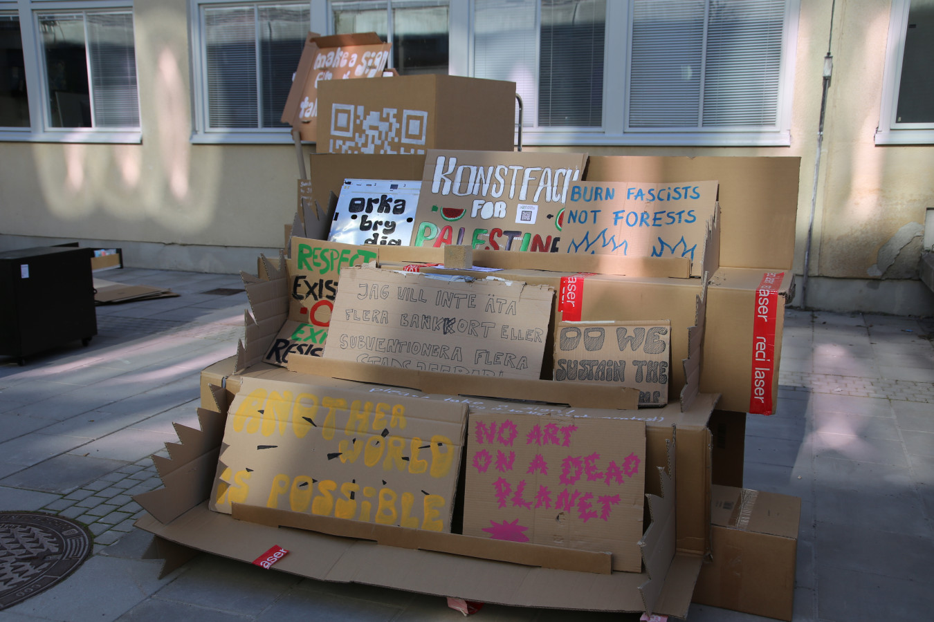 My building plans had worked out well and my exhibit took up a lot of space, as i had hoped; people stopped to look and sometimes even talk to me and quite a few of them painted signs. But the general reception left me quite disappointed with the way that challenges to Konstfack's status quo are handled. At best, i got recommendations for further reading or the recognition that the work was current and important, but none of it ever seemed to translate into a remote interest in acting onâor even just reacting toâmy criticism. Looking at the need for immediate and radical responses to the crises and atrocities that this work is trying to fight, i am left with a feeling of anxious desperation.