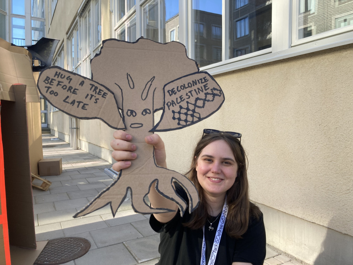talking tree sign my classmate elin came by to make a climate and palestine sign, that now adorns the door of a bathroom stall at school :) ← →