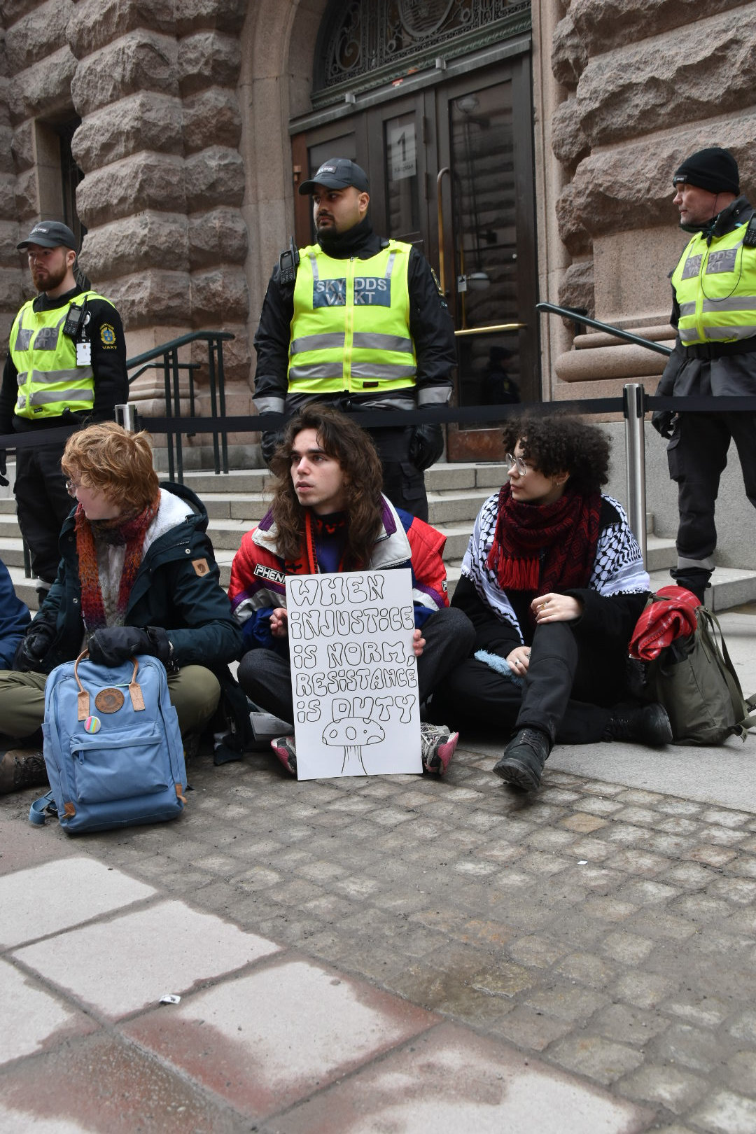 On Monday, the 11th of March 2024, i was a part of a group of young climate activists who sat down in front of the doors of the Swedish parliament, the Riksdag, symbolically blocking politicians from coming in, coming back every day for a week, despite harsh police responses. Using the letter shapes i internalised in the creation of struggle, i made a sign reading "WHEN INJUSTICE IS NORM, RESISTANCE IS DUTY" on the back of a subway ad, directing talking to the public walking by or watching, and telling people to join the protest. The action was not only criticising, it was also an extremely powerful generative force. School classes, pensioners, tourists and people on their way to work passed by, asked questions about why we were protesting or how they could get engaged, and even sat down next to us, creating a new forum for discussion outside commonly accepted frameworks. People wrote poems and read books. During the week, the protest also acted as a force for creating community, with a tight-knit kinship building between people sitting in the blockade and the support group around, that volunteered to provide food and care.