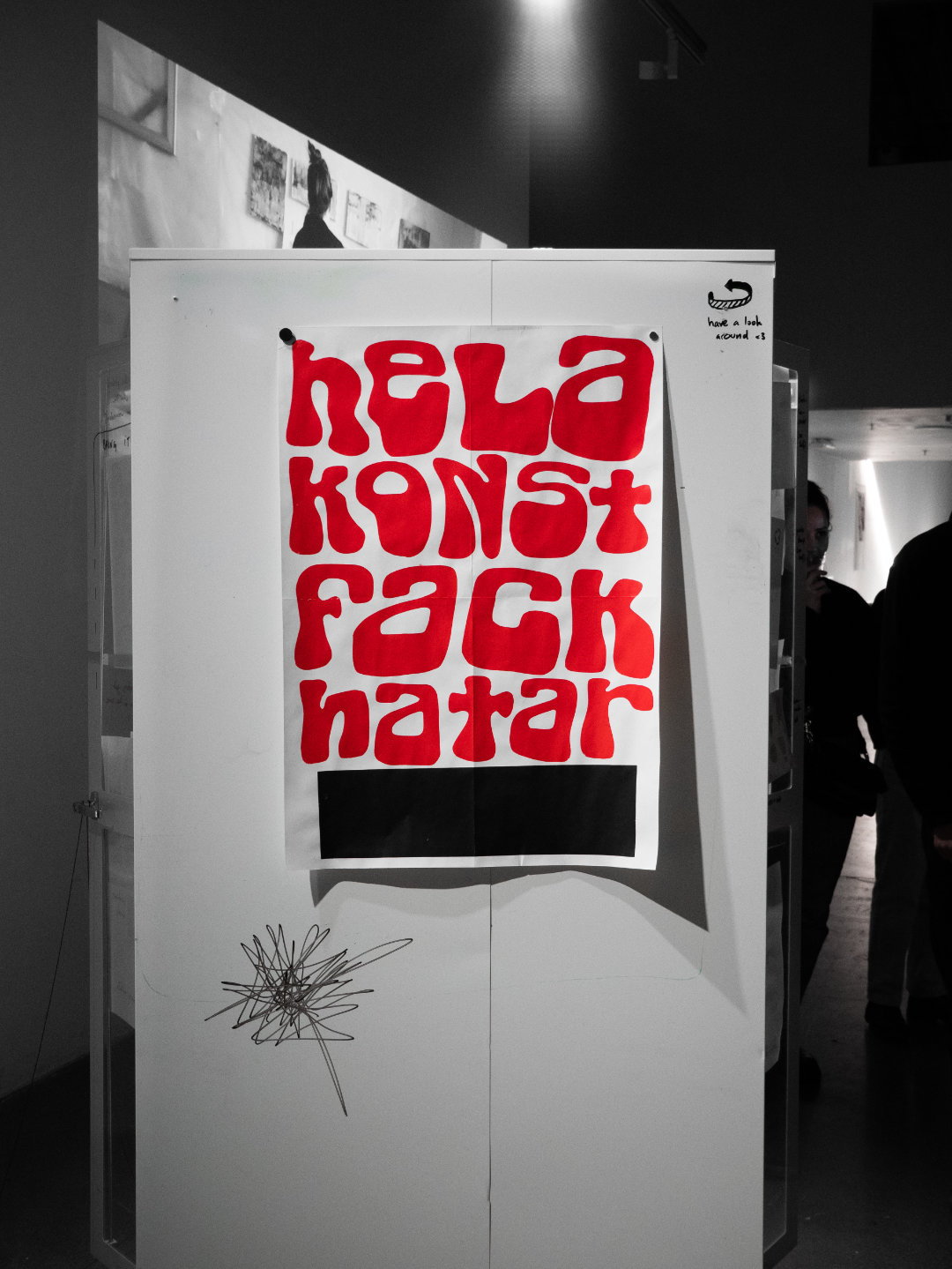 Trying to create a more eye-catching alternative to the typical announcement poster, i created "trash posters", with the messaging painted on pieces of garbage taken from Konstfack's recycling containers. The resulting artefacts stayed in place, or were carefully moved to other, partially even more visible locations, over the time of several weeks, something my posters from print dialog never managed to achieve; i attribute the success to the uniqueness of the artefacts.