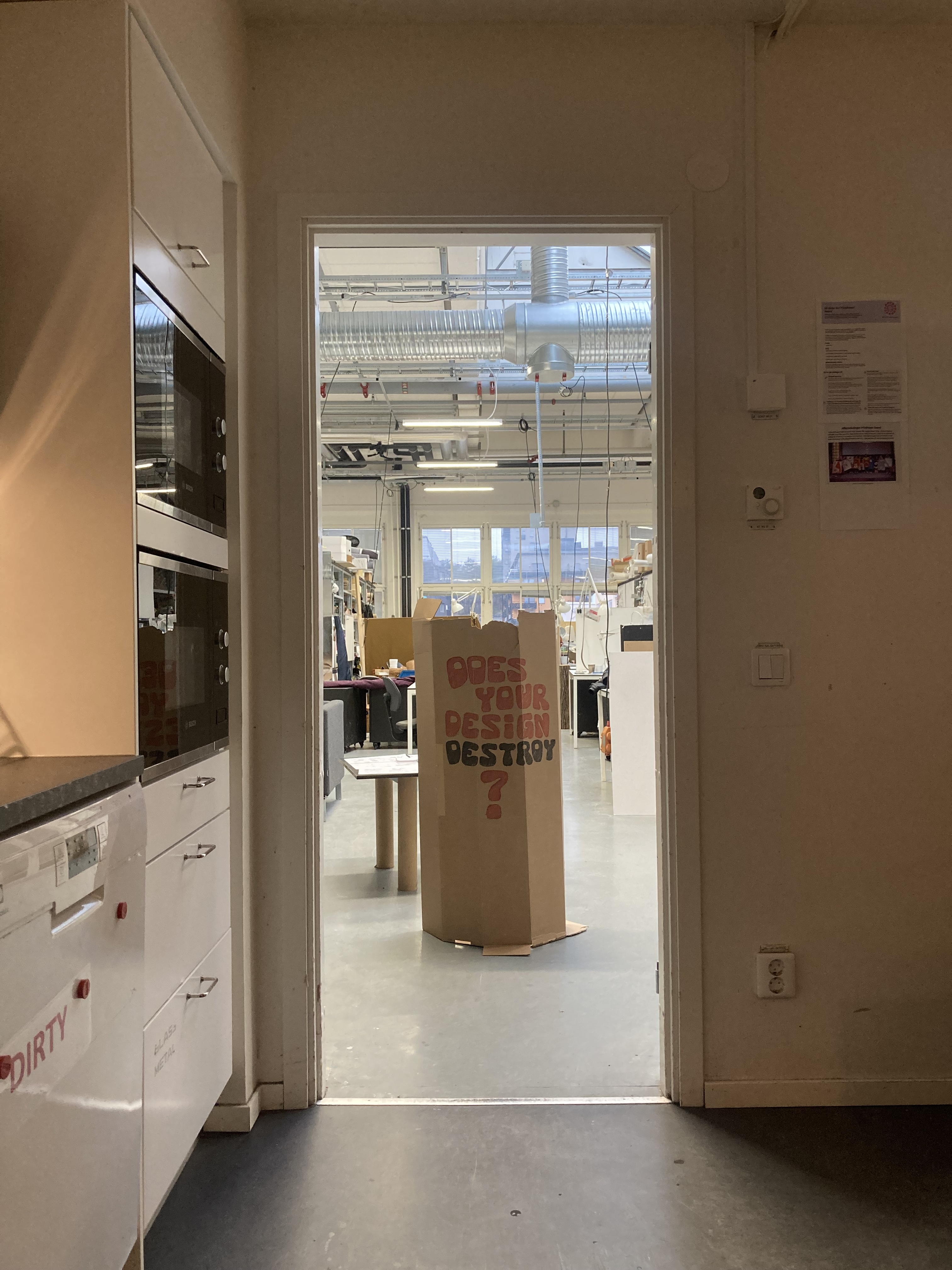 As a discursive artefact, i built a half-cylindrical cardboard sign asking the question "DOES YOUR DESIGN DESTROY?", and placed it in the way for people trying to enter the Industrial Design studio space—making students confront themselves with the very nature of their creations. The question is inspired by the concept of the defutured, which sees much—if not almost all—of today's design practice as actively barring us from the existence of a viable future (Fry, 2020 [1999]).